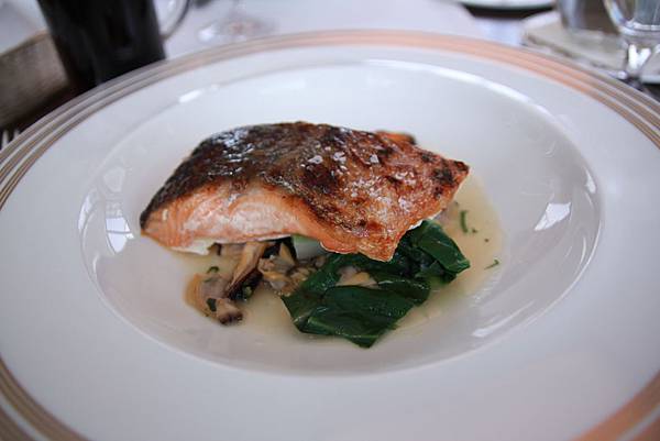 主菜, 是烤鮭魚佐蛤蠣巧達 & 萵苣甜菜
